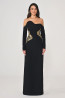 ياقة مكشوفة الكتفين، أكمام طويلة، قصة مستقيمة (عمودية)، فستان سهرة